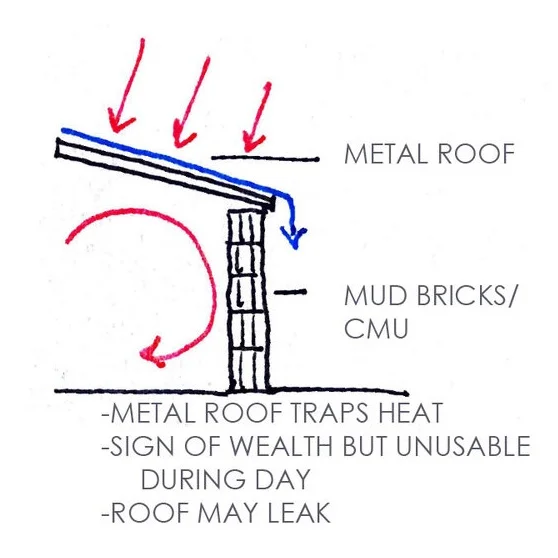 The typical vernacular is mud wall with thatch roof that is held up on wooden posts. There is a more modern take on the vernacular that has mud bricks or CMU walls with a metal roof. This design shows wealth but traps the heat inside making the home uncomfortable during the day.